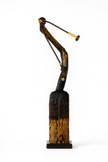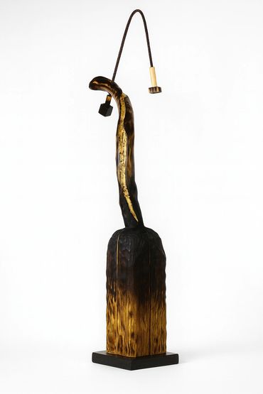 This artwork is entirely handmade. It stands on a natural log, securely attached to a wooden base that balances its structure and enhances its organic character. A large portion of the upper section is covered in 24K gold, creating a striking contrast between the strength of metal and the delicacy of the golden finish.
