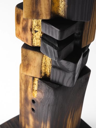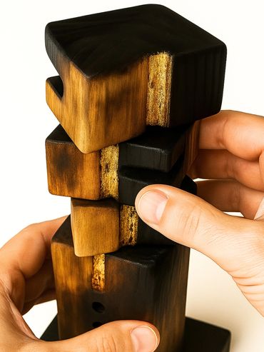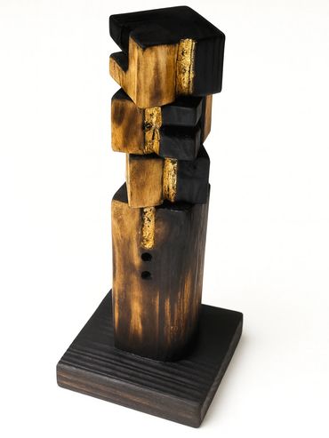 This artwork is entirely handmade and composed of two main parts: the lower base, crafted from wood, and the upper section, formed by three independent pieces that can rotate separately.